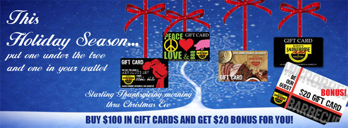 What has become an annual tradition, starting Thanksgiving morning (yes, we're open Thanksgiving morning for growler fills, a pint without the relatives and to pick up Thanksgiving Feasts To Go!) and through Christmas Eve, for every $100 in gift cards you buy, we'll give you a bonus $20 gift card that you can use yourself. (Yeah, you can use the $100 gift cards yourself too.) It's a little way for us to say thanks for your patronage. Available at our brewpub. Happy Holidays from everyone at the Smokehouse!