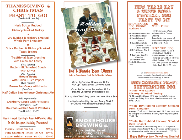 What has become an annual tradition, starting Thanksgiving morning (yes, we're open Thanksgiving morning for growler fills, a pint without the relatives and to pick up Thanksgiving Feasts To Go!) and through Christmas Eve, for every $100 in gift cards you buy, we'll give you a bonus $20 gift card that you can use yourself. (Yeah, you can use the $100 gift cards yourself too.) It's a little way for us to say thanks for your patronage. Available at our brewpub. Happy Holidays from everyone at the Smokehouse!